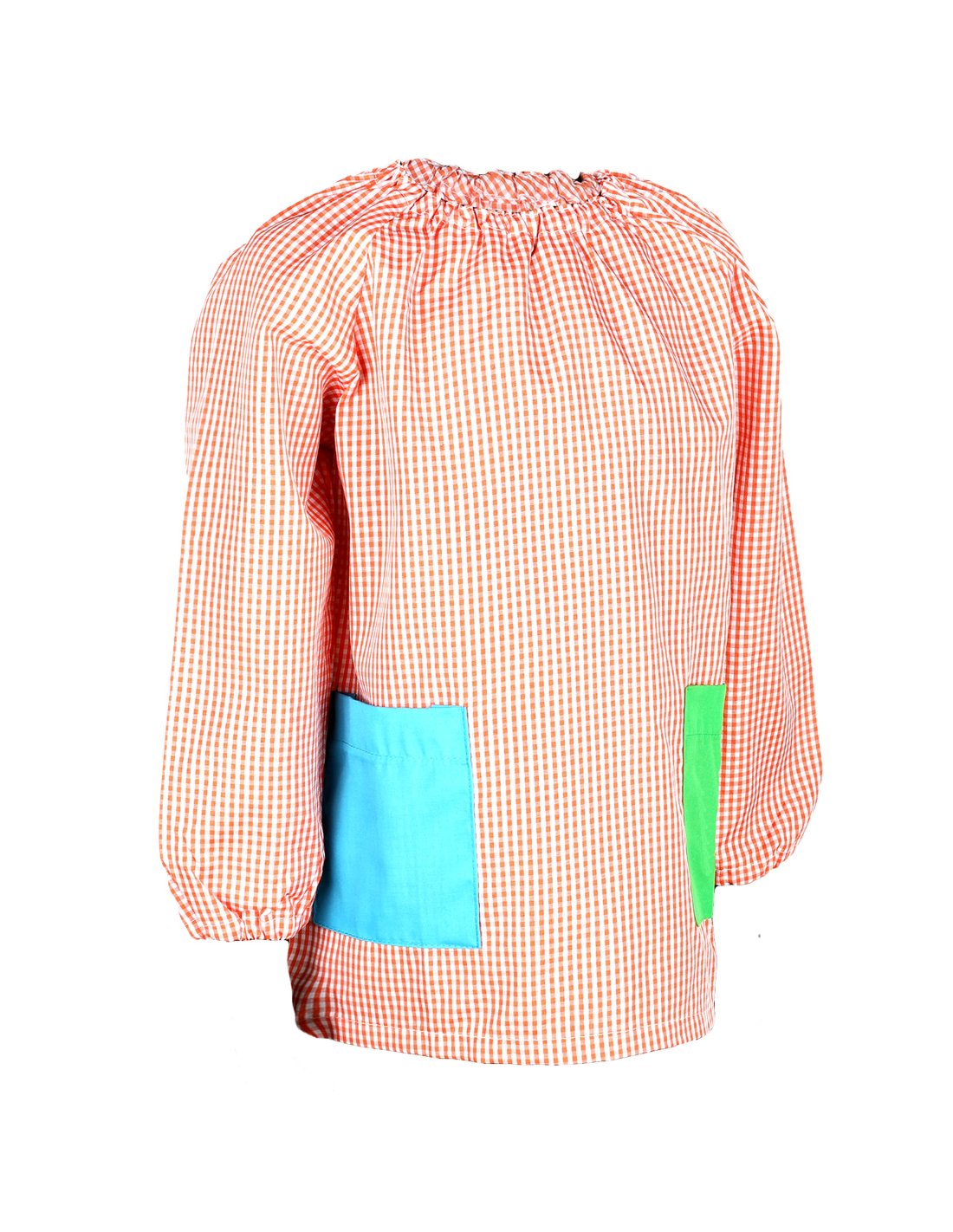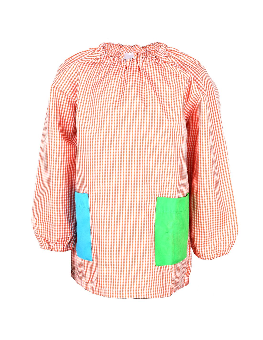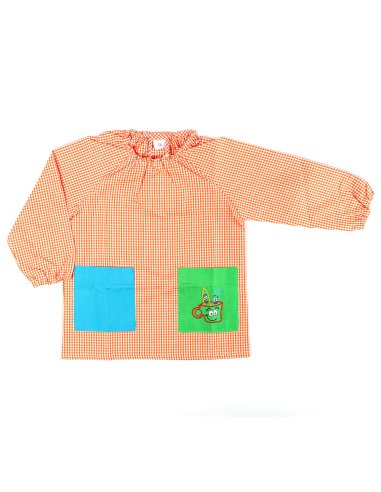 Bata escolar infantil es tipo saco sin botones y con goma elástica en los puños y cuello para mayor protección. Tiene un bolsillo central con dibujo. Dispone de un asa en el cuello para colgar en percheros.
