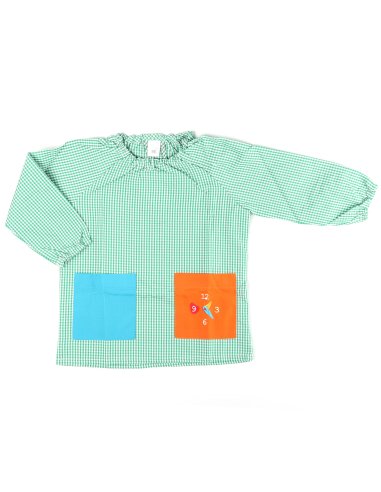 Bata escolar infantil es tipo saco sin botones y con goma elástica en los puños y cuello para mayor protección. Tiene un bolsillo central con dibujo. Dispone de un asa en el cuello para colgar en percheros.